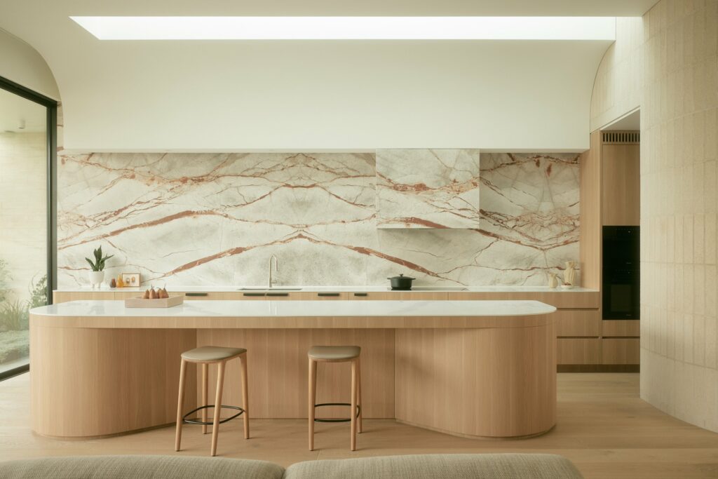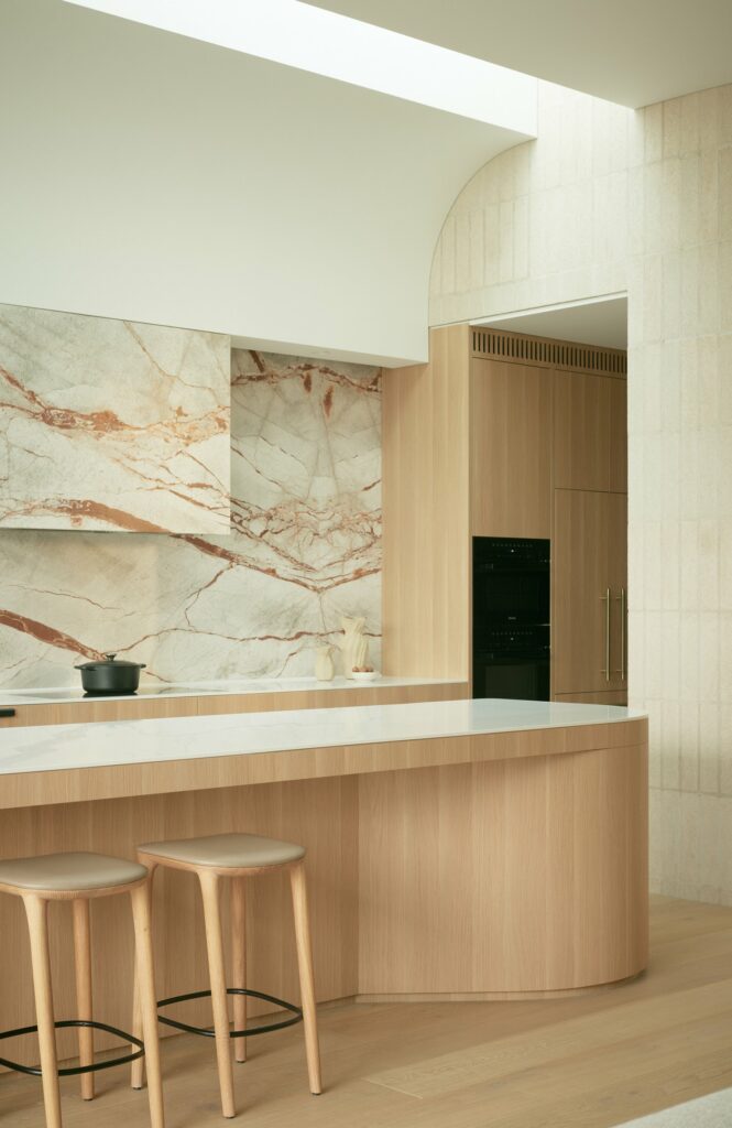 “Fantasy Grey Marble, light oak timber veneer, and white Corian unite, creating a sculptural and functional kitchen.”