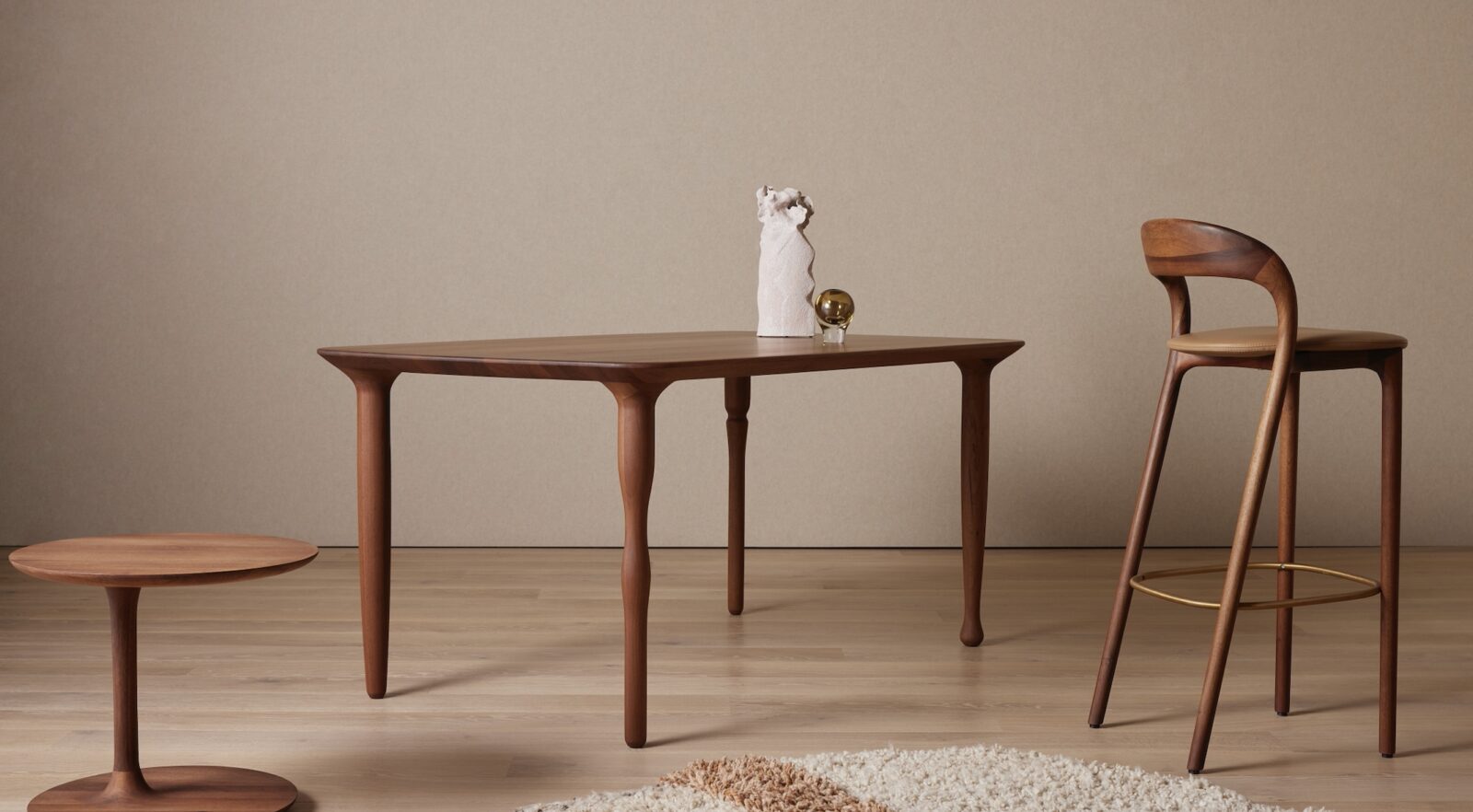 The Echoes in Wood series highlights Artisan’s rich textures and an earthy palette, and the company’s innate ability to harmonise heritage with innovation to create pieces that adapt effortlessly to both contemporary and classic interiors. The series also features the Soft Shelf and Wall Modules, functional storage solutions that double as elegant room dividers, the theatrical Artisan Wu chair, distinguished by its intricate joint detailing and gently curved legs, and the Neva Light bar stool, with its delicately crafted surfaces and sensuous, fluid form.