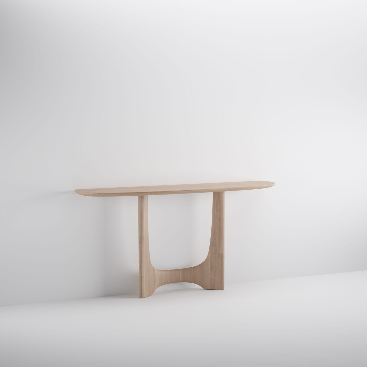 Its simplified geometry allows the wall to complete the composition, leaving the handcrafted timber support to define the piece. The result is a console that feels grounded yet visually light.