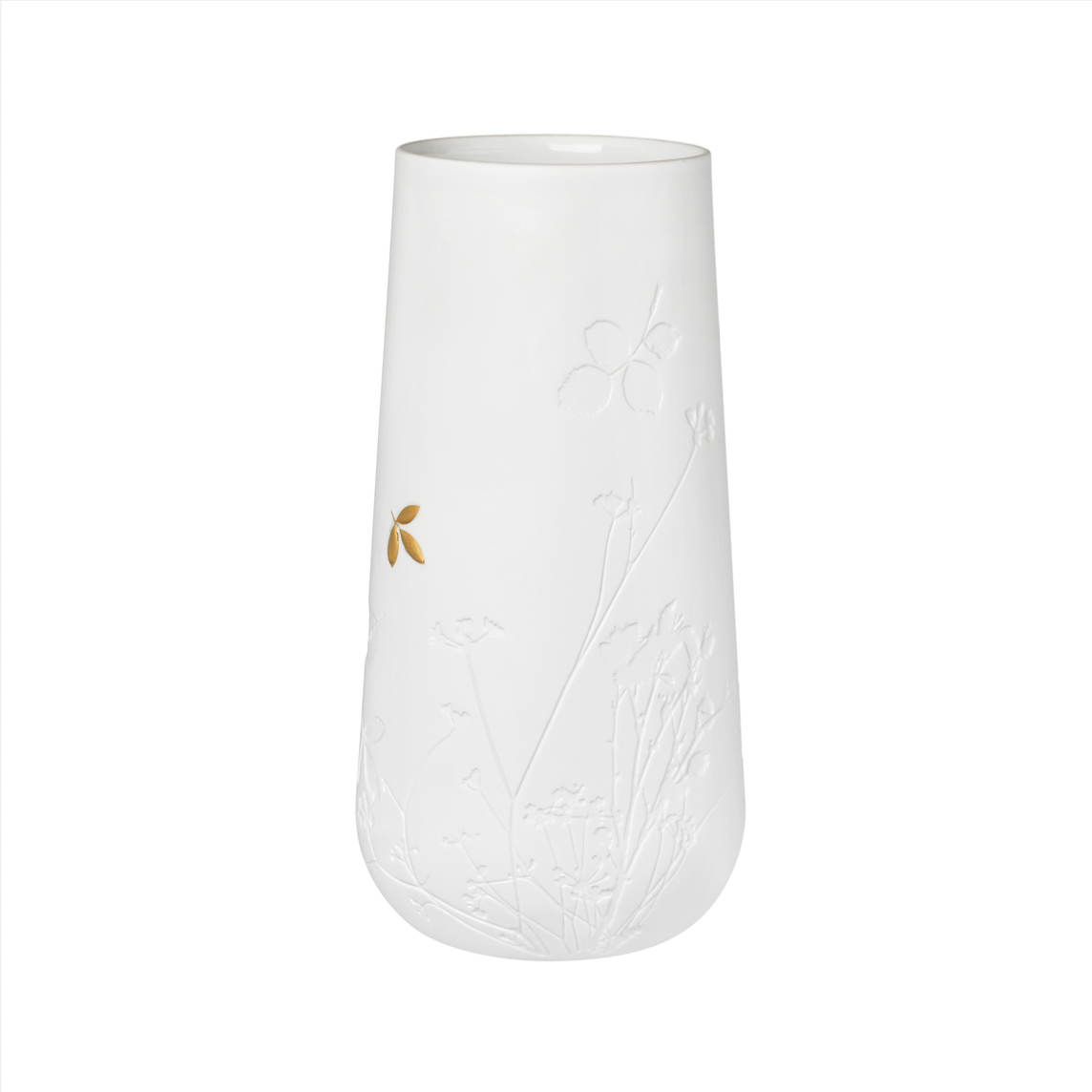 The Gold Leaf Vase by Räder captures the quiet elegance of nature in porcelain. Embossed with delicate twigs and leaves, its unglazed exterior contrasts beautifully with a smooth glazed interior, creating both texture and warmth.